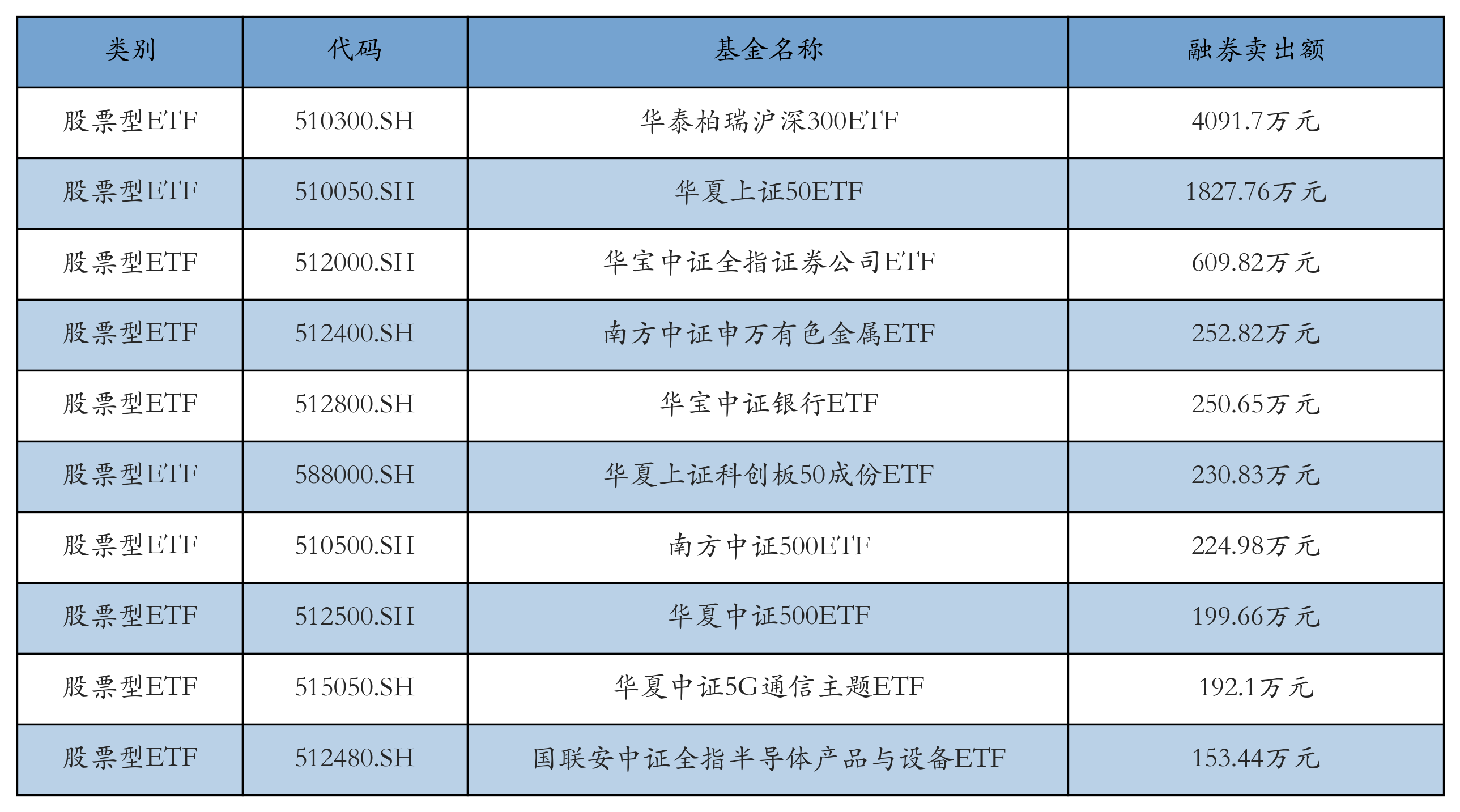 昨日股票型ETF融资卖出额最高的3只ETF及其卖出金额分别为:华泰柏瑞沪深300ETF(4091.7万元)、华夏上证50ETF(1827.76万元)、华宝中证全指证券公司ETF(609.82万元)。融券卖出额前10详情见下表:
