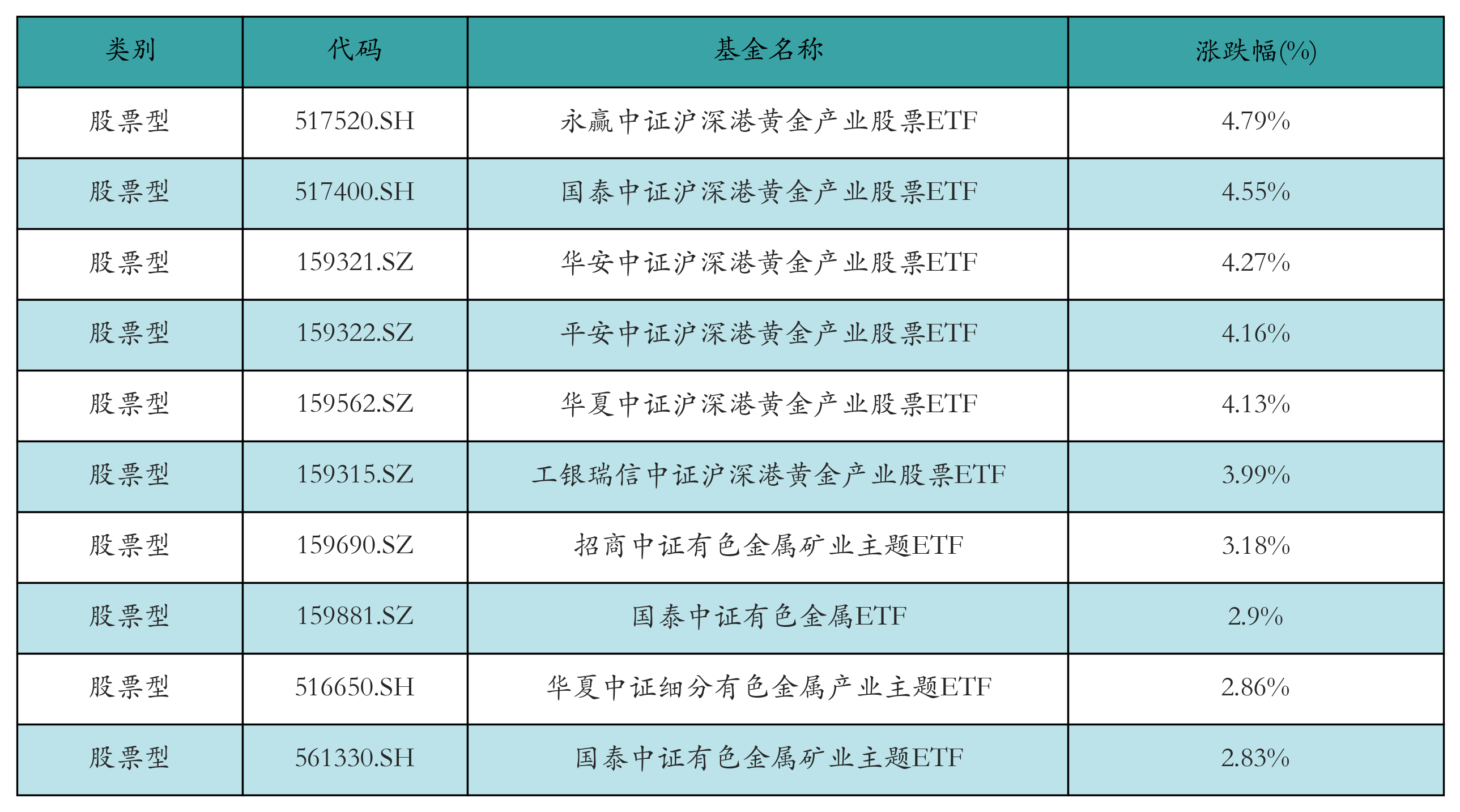 昨日股票型ETF涨幅最高的3只ETF及其收益率分别为:永赢中证沪深港黄金产业股票ETF(4.79%)、国泰中证沪深港黄金产业股票ETF(4.55%)、华安中证沪深港黄金产业股票ETF(4.27%)。涨幅前10详情见下表: