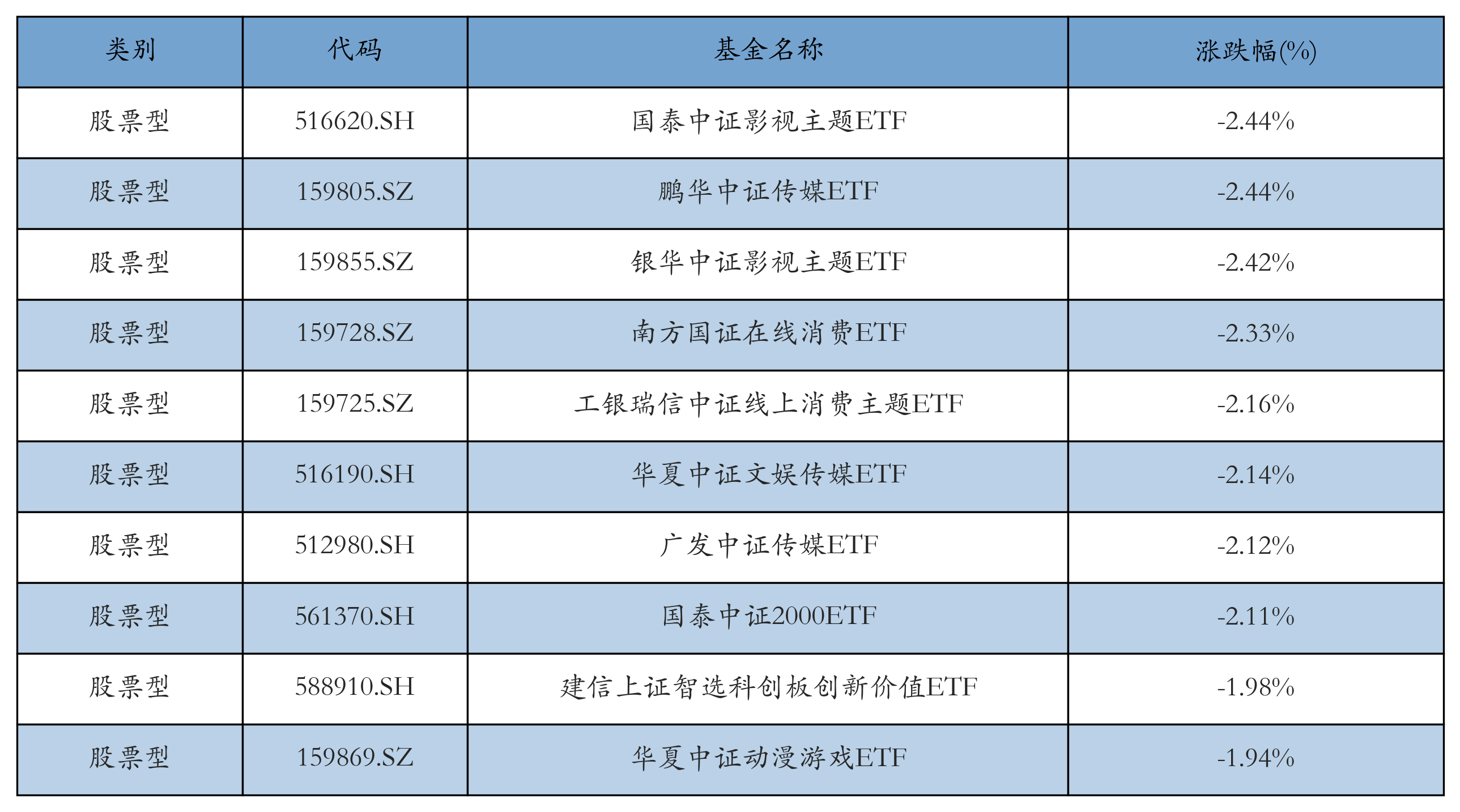 昨日股票型ETF跌幅最大的3只ETF及其收益率分别为:国泰中证影视主题ETF(-2.44%)、鹏华中证传媒ETF(-2.44%)、银华中证影视主题ETF(-2.42%)。跌幅前10详情见下表: