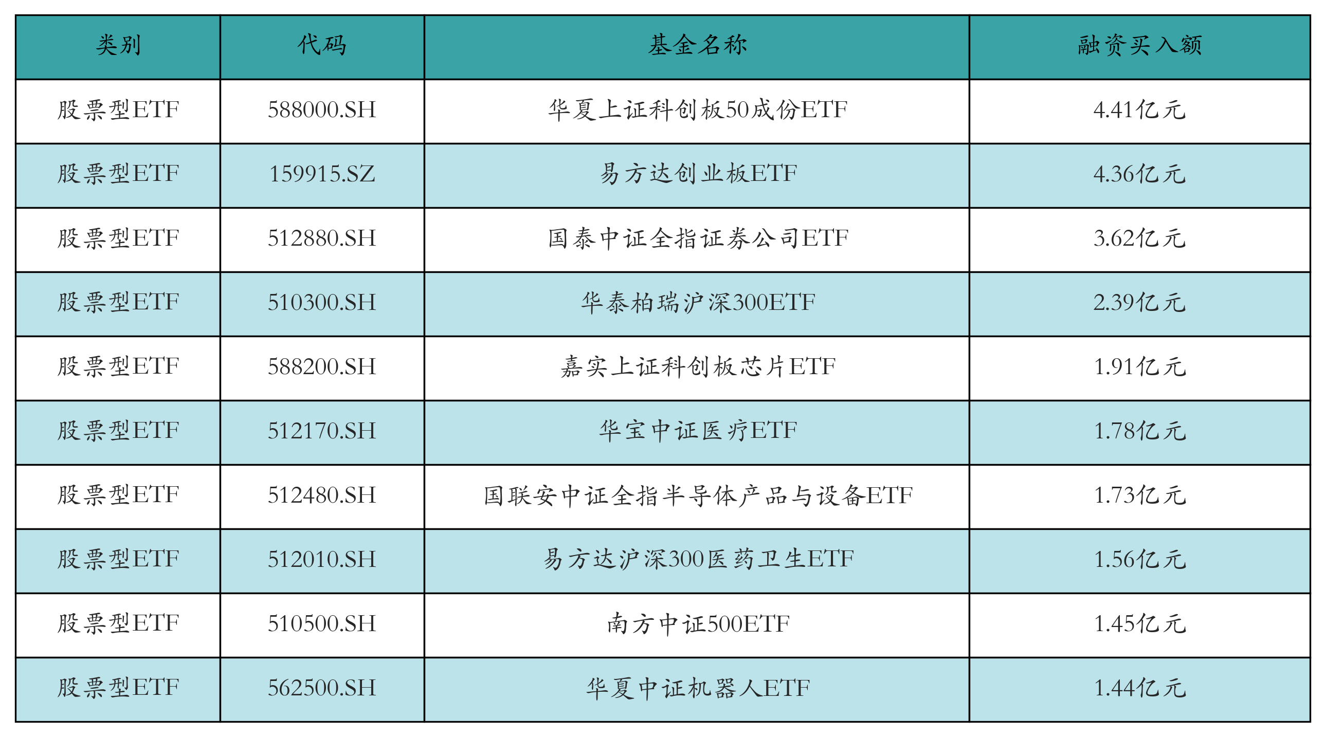 昨日股票型ETF融资买入额最高的3只ETF及其买入金额分别为:华夏上证科创板50成份ETF(4.41亿元)、易方达创业板ETF(4.36亿元)、国泰中证全指证券公司ETF(3.62亿元)。融资买入额前10详情见下表: