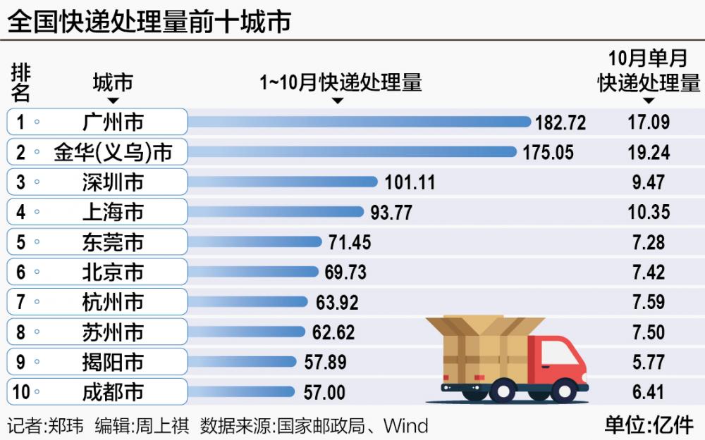 紧随其后,广州市10月单月快递处理量达到17.09亿件,位列全国第二。值得注意的是,如果把时间拉长到全年1-10月,广州全市快递处理量则达到182.72亿件,位居全国第一。