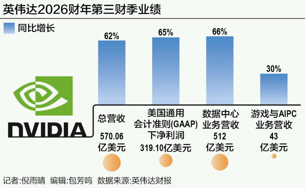 美东时间11月19日,英伟达公布了2026财年第三财季业绩。财报显示,英伟达当季营收达570.06亿美元,同比增长62%,高于预期的542亿美元;美国通用会计准则(GAAP)下净利润达319.10亿美元,同比增长65%。