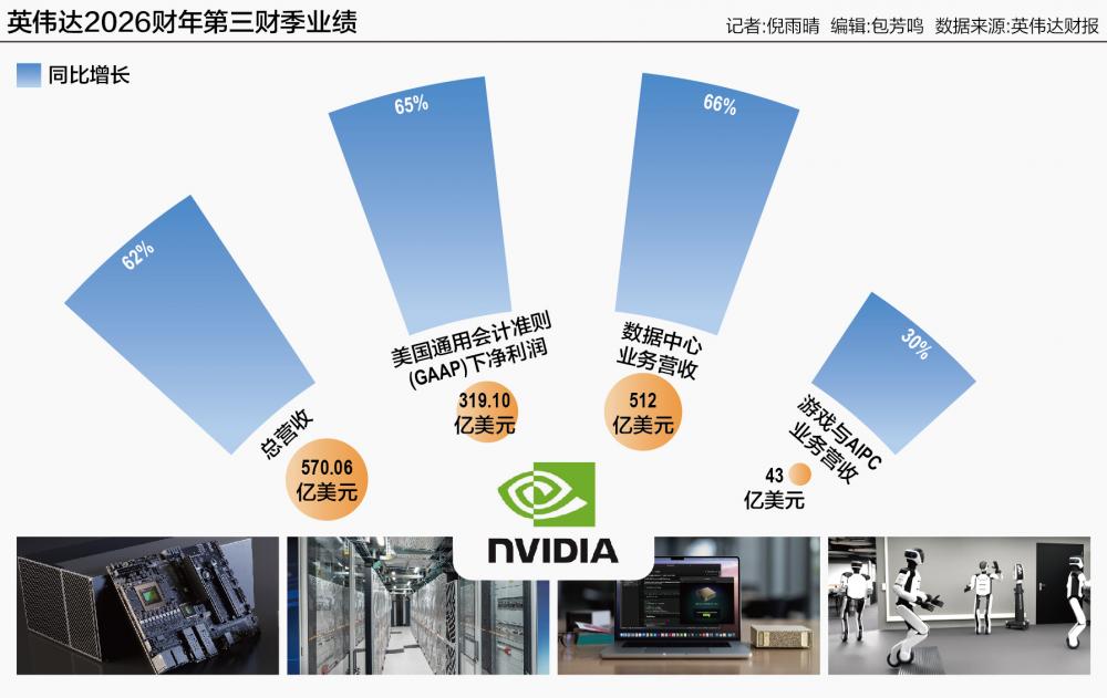 美东时间11月19日,英伟达公布了2026财年第三财季业绩。财报显示,英伟达当季营收达570.06亿美元,同比增长62%,高于预期的542亿美元;美国通用会计准则(GAAP)下净利润达319.10亿美元,同比增长65%。