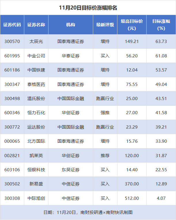 南财投研通数据显示,11月20日,券商给予上市公司目标价共12次,按最新收盘价计算,目标价涨幅排名居前的公司有太辰光、中金公司、中国铁建,目标价涨幅分别为63.73%、61.08%、53.57%,分别属于通信设备、证券、基础建设行业。