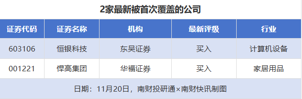 首次覆盖方面,11月20日券商共给出了2次首次覆盖,其中恒银科技获得东吴证券给予“买入”评级,悍高集团获得华福证券给予“买入”评级。