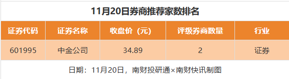 从券商推荐家数来看,11月20日有37家上市公司得到券商推荐,其中中金公司获得2家推荐。