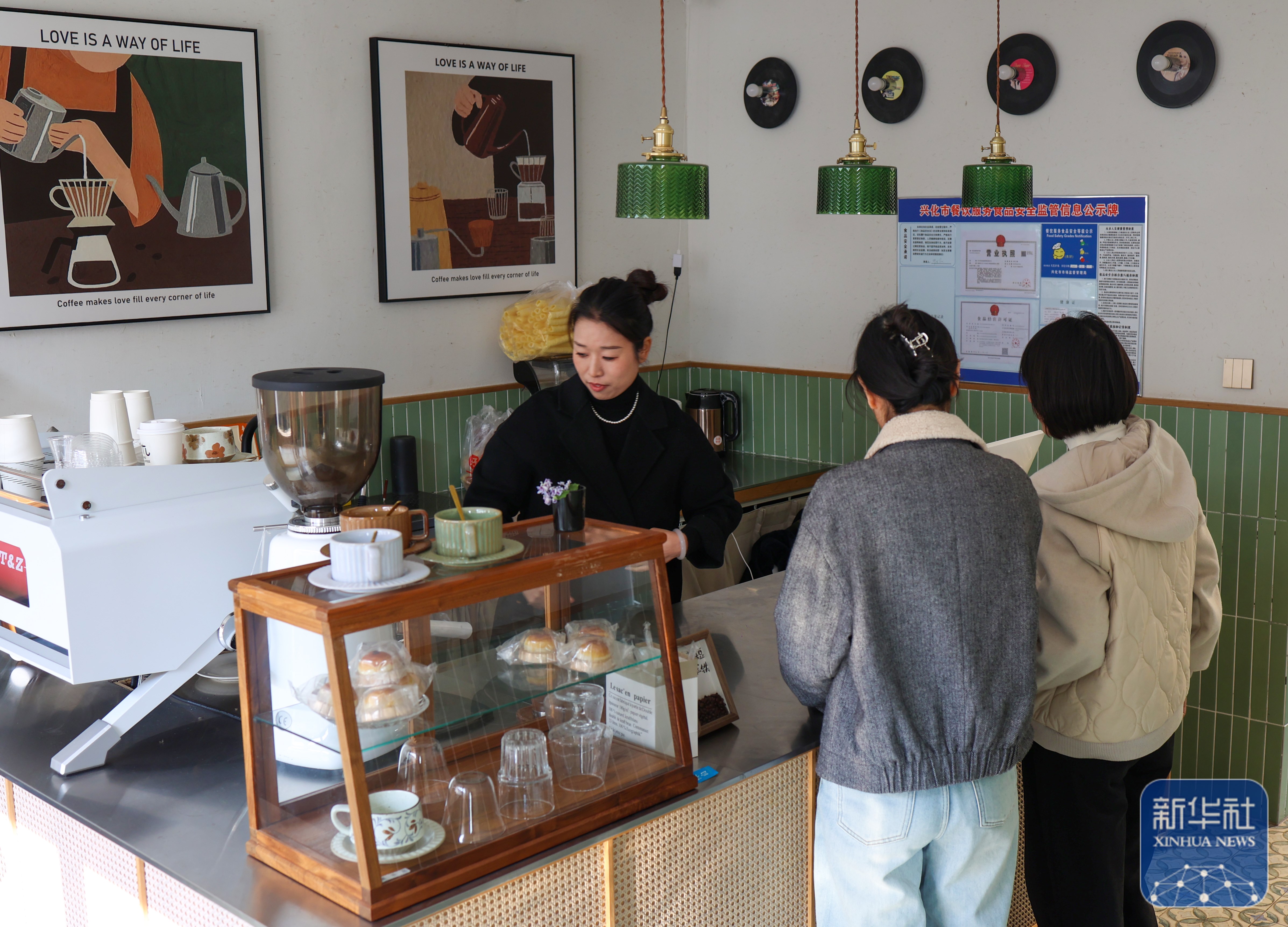 ↑ 11月21日,在江苏省兴化市千垛镇东罗村,咖啡馆老板高庆英(左)接待顾客。高庆英大学毕业后曾在上海工作,如今返乡创业开起了咖啡馆。