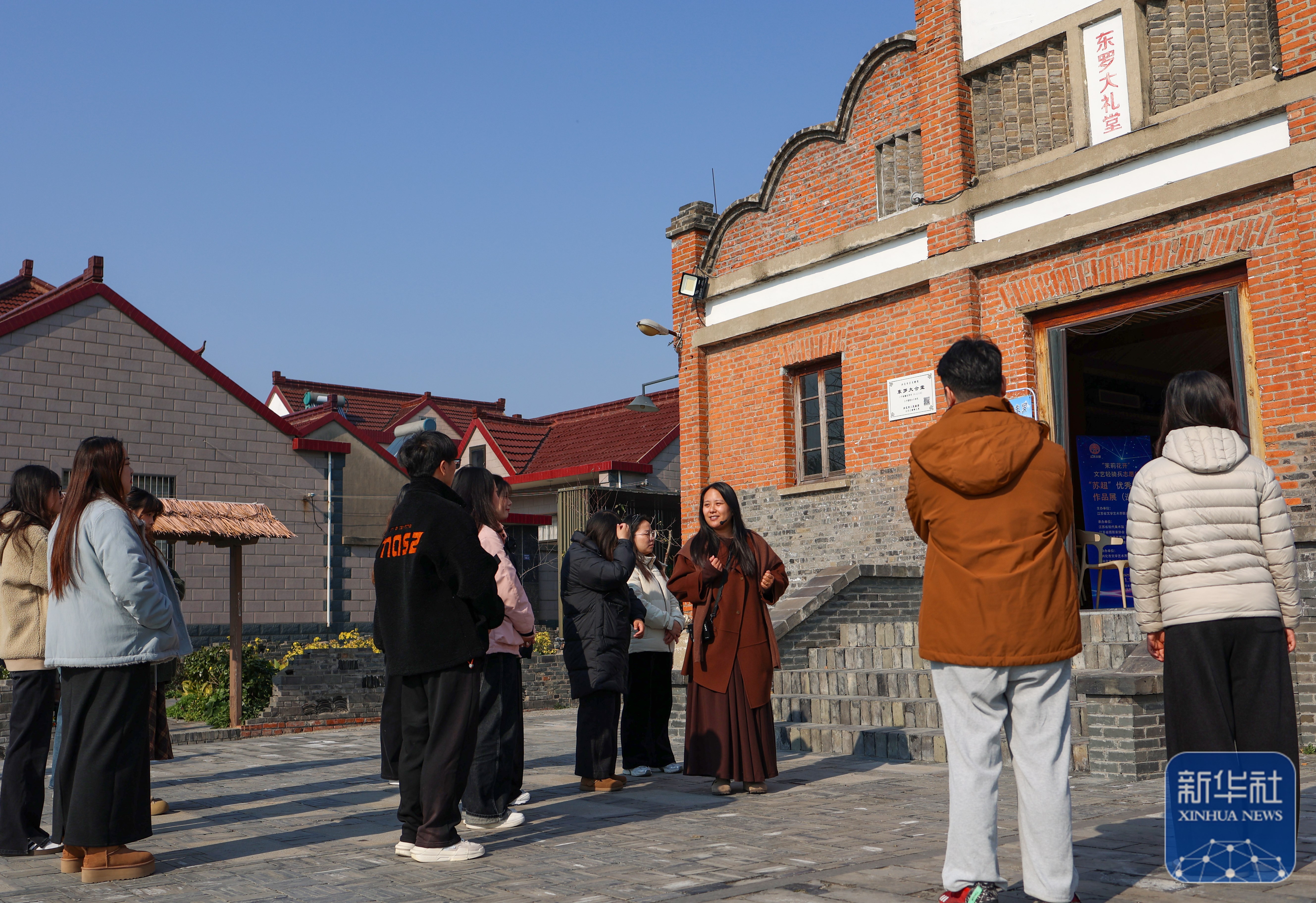 ↑ 11月21日,在兴化市千垛镇东罗村,卜玥(右三)为来村旅游的客人讲解。卜玥过去在外工作,随着村里旅游业的发展,回村当起了导游。今年10月,东罗村获评联合国世界旅游组织“最佳旅游乡村”。