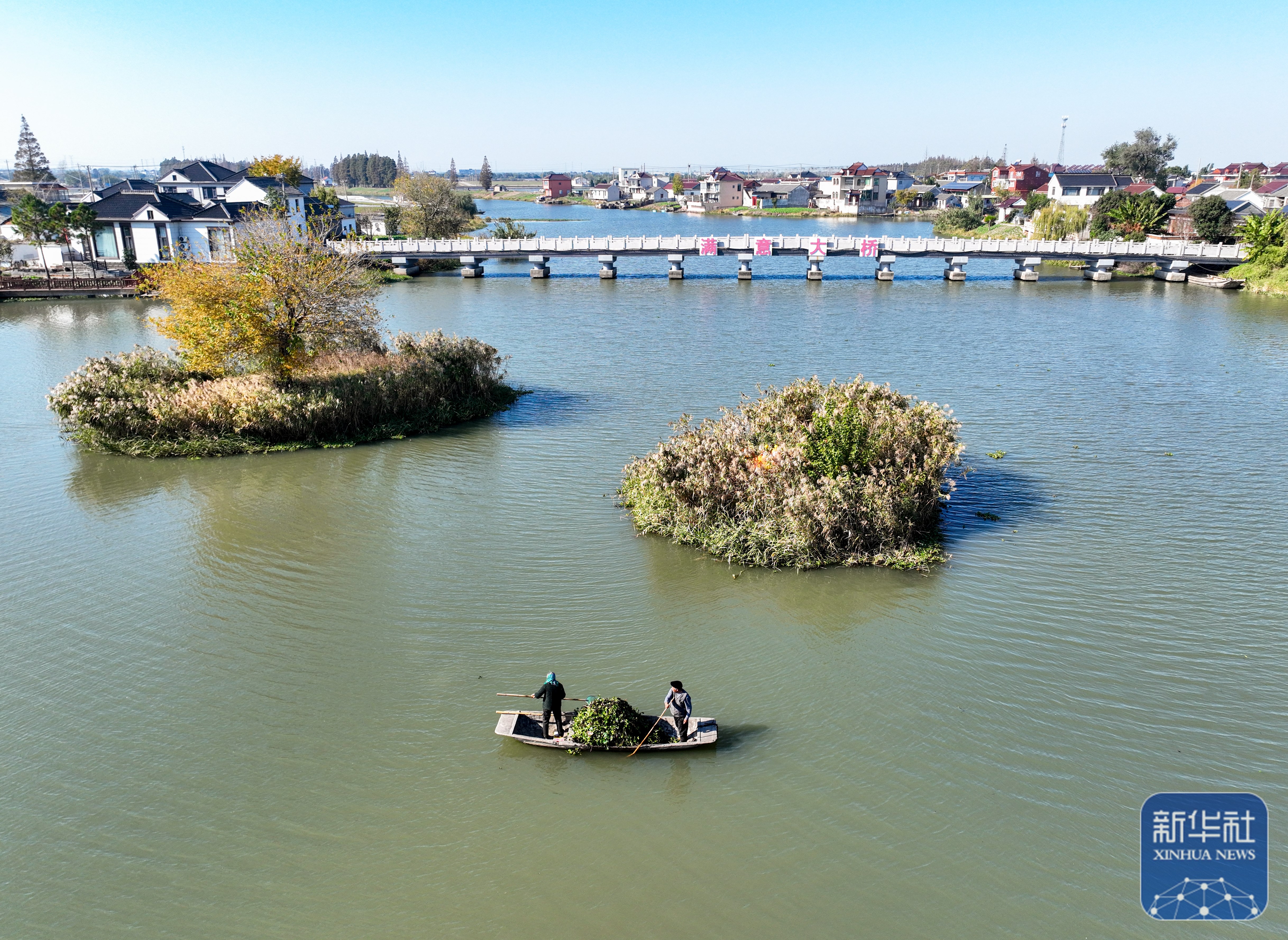 ↑ 11月21日,在江苏省兴化市海南镇刘泽村,村民清理河道漂浮物(无人机照片)。