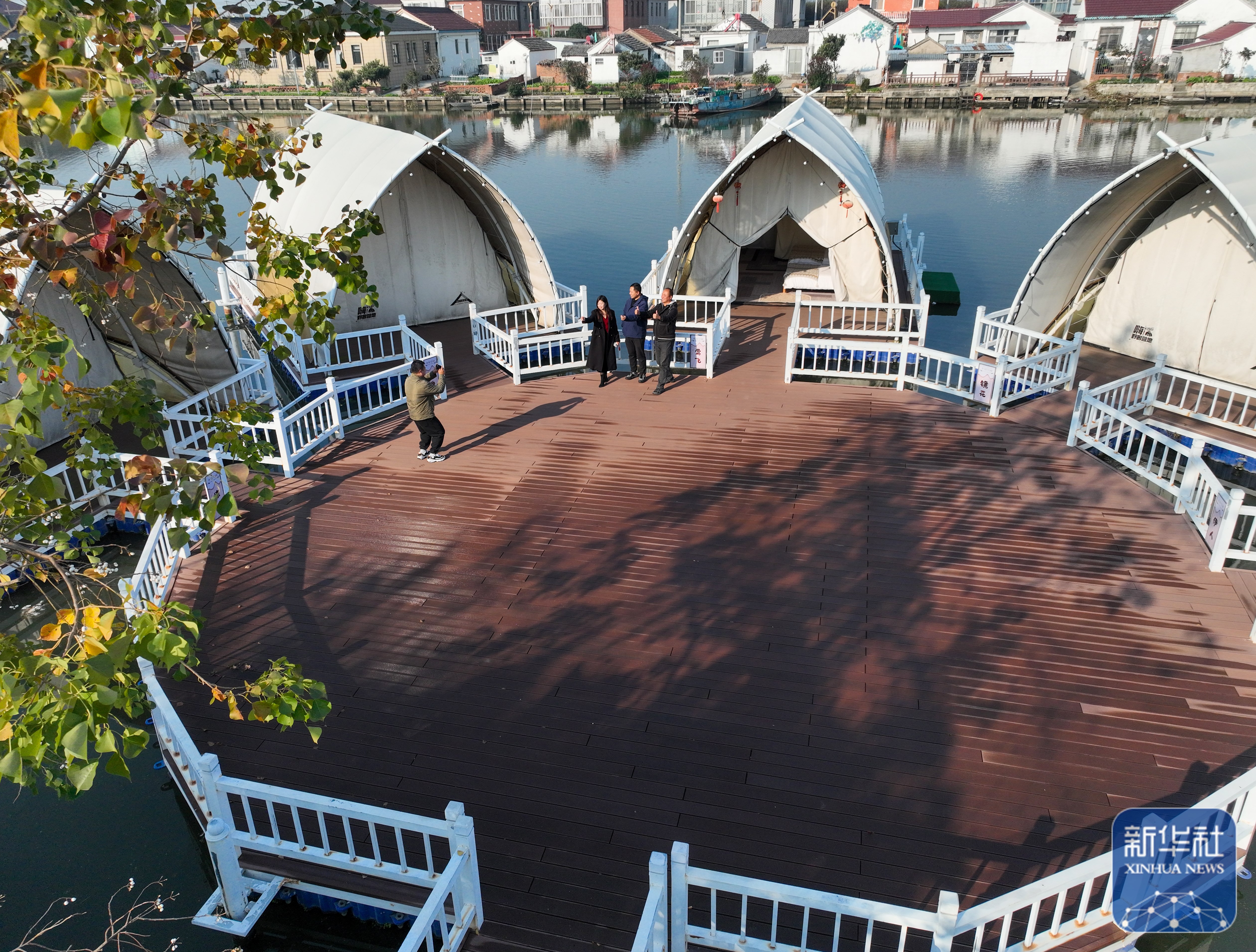 ↑ 11月21日,在江苏省兴化市千垛镇陈杨村,水上民宿迎来客人(无人机照片)。