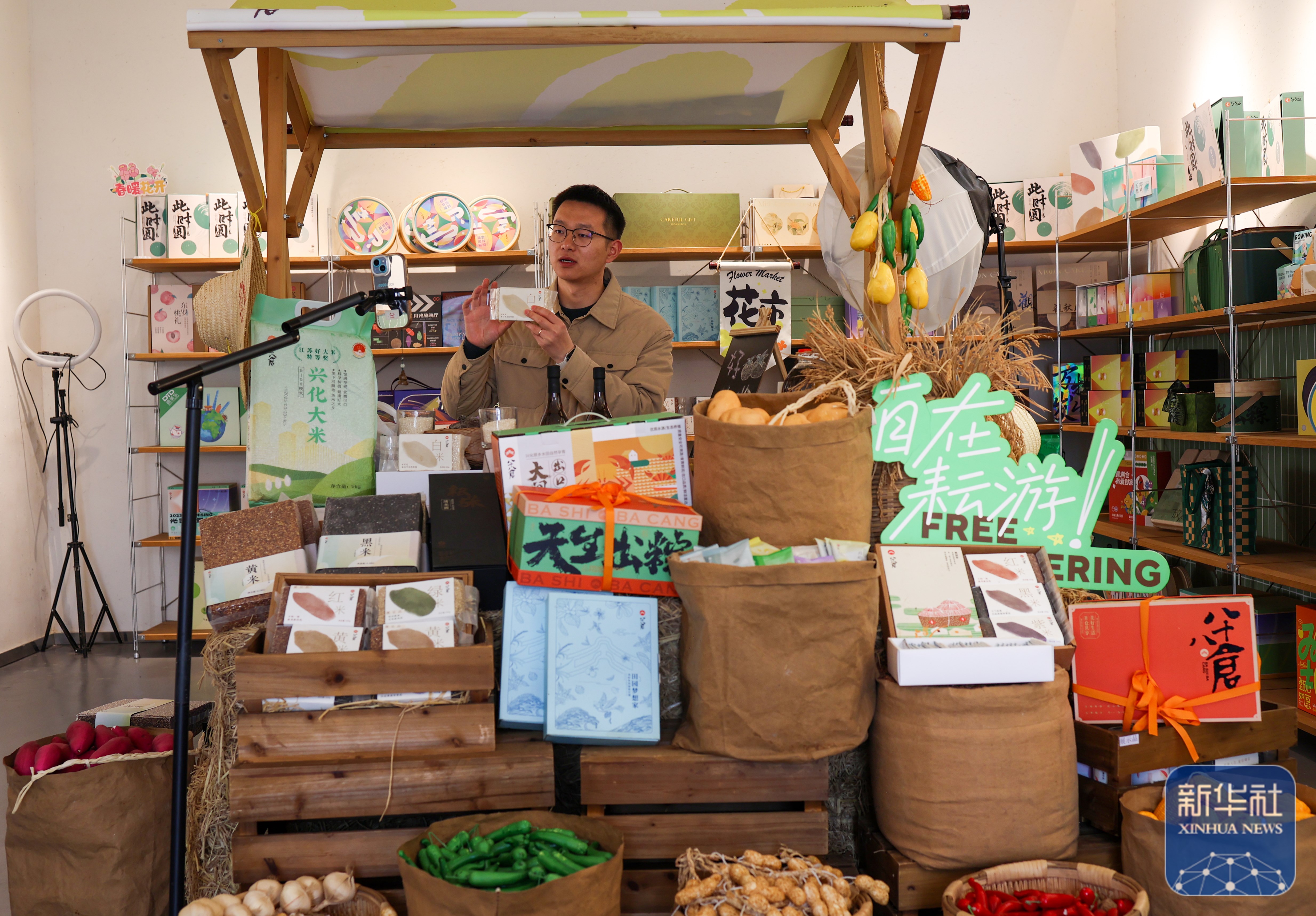 ↑ 11月21日,在江苏省兴化市千垛镇东罗村,网上销售直播人员介绍当地特色农产品。