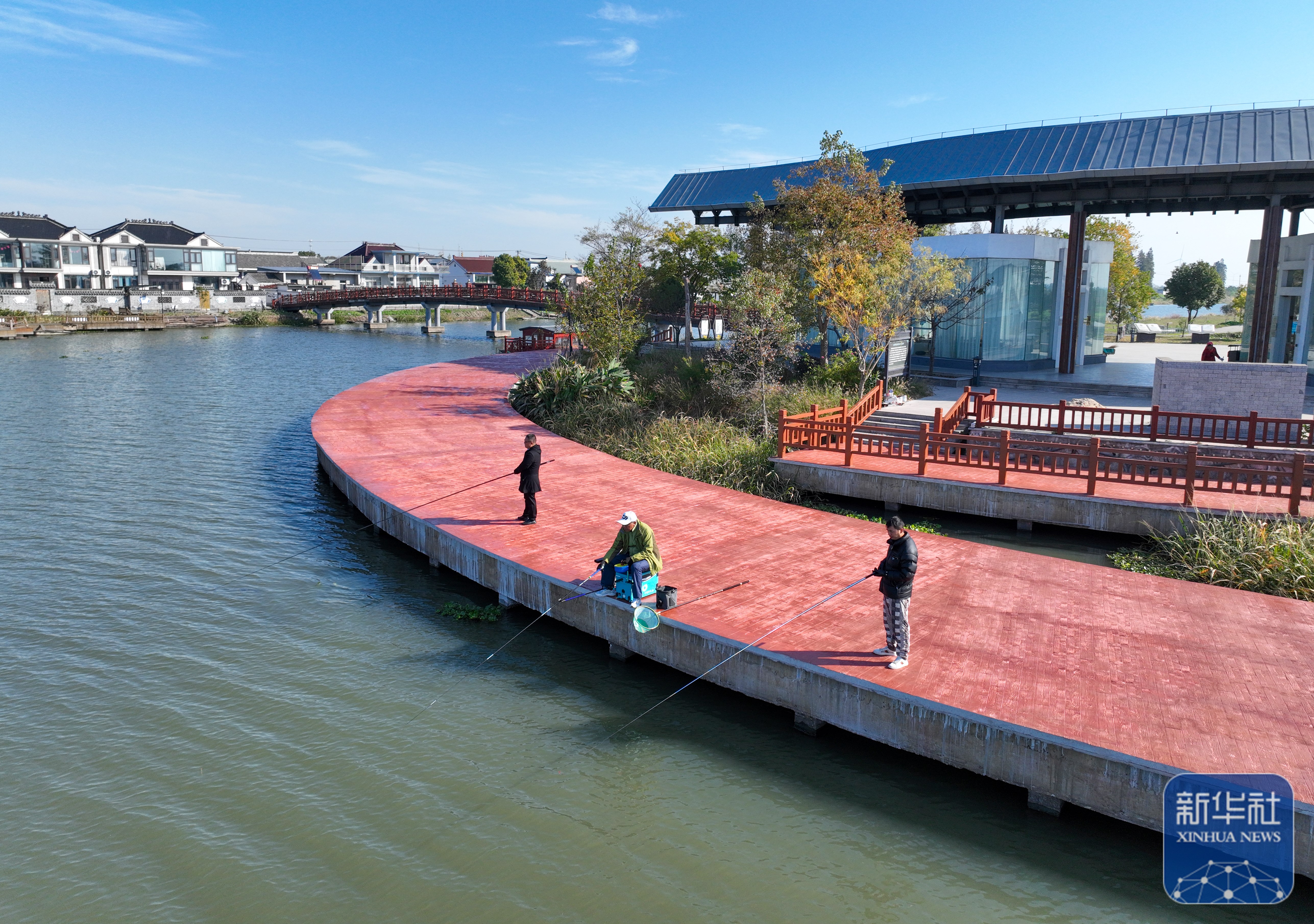 ↑ 11月21日,村民在兴化市海南镇刘泽村河边垂钓(无人机照片)。