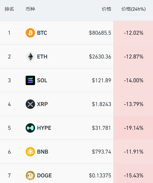 加密货币方面再次集体大跳水。比特币跌破81000美元关口。截至北京时间20:30,比特币报80685美元/枚,跌超12%。其他主要币种方面,以太坊跌超12%,SOL币跌超14%,狗狗币跌超15%。过去24小时,全网超42万人被爆仓,爆仓总金额超21亿美元。