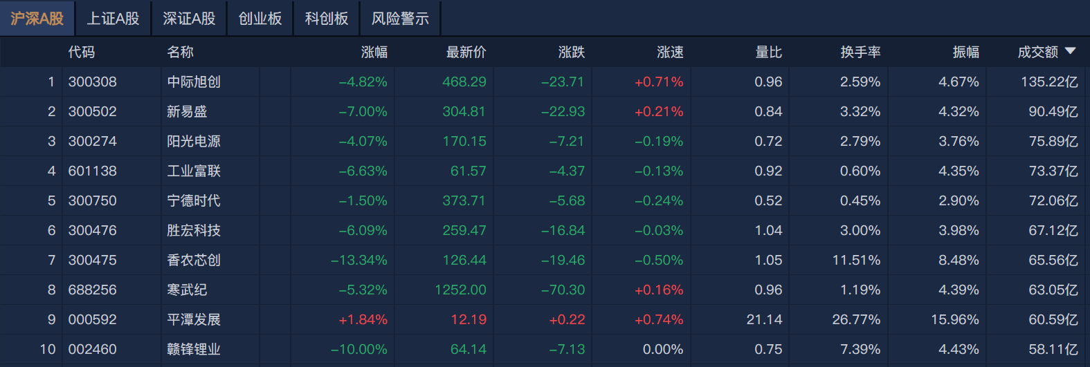 南财金融终端显示,个股方面,中际旭创半日成交额超135亿元居首,新易盛、阳光电源、工业富联成交额靠前。
