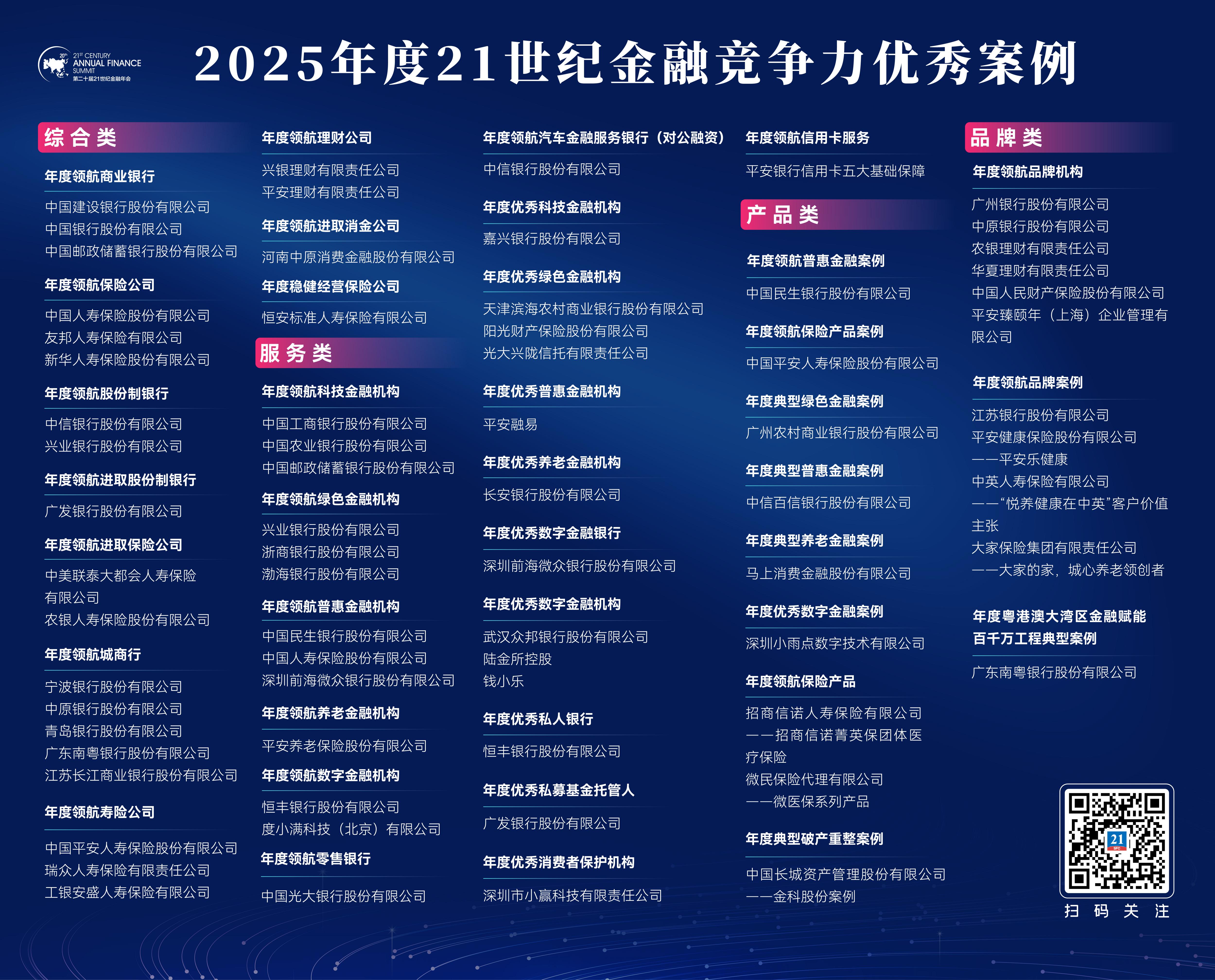 2025年度21世纪金融竞争力优秀案例揭晓,涵盖银行、保险、理财等领域,聚焦科技、绿色、普惠金融创新。
