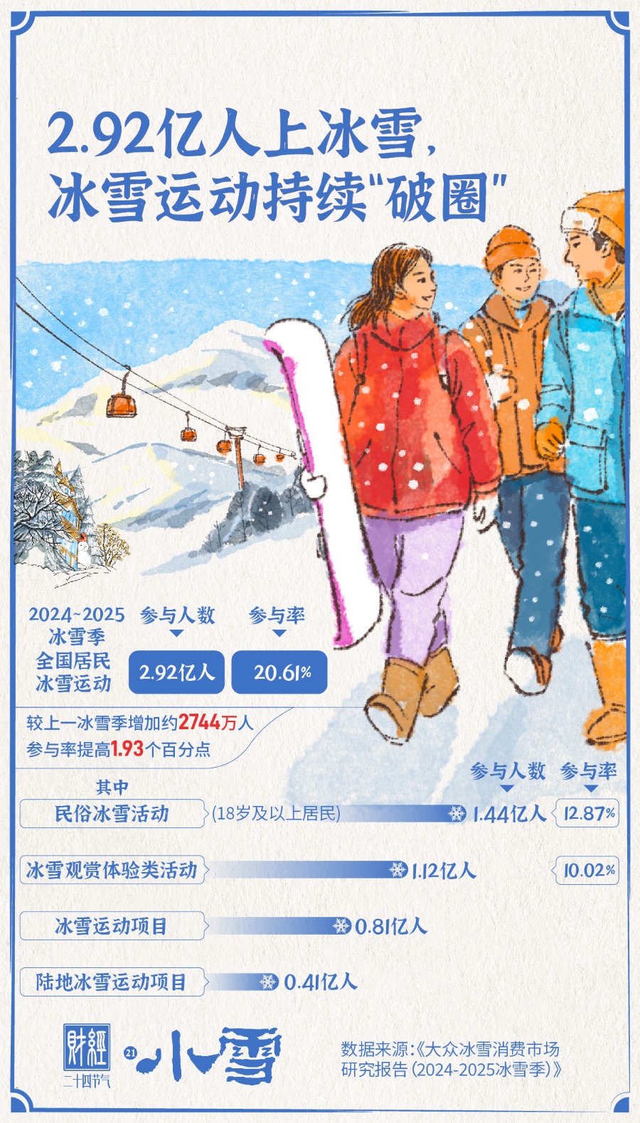 小雪已至,朔风催雪,冰雪经济市场活力涌动。第十五届全国运动会的举办点燃了全民运动热情,体育活力持续释放,冰雪运动从专业赛场走向大众生活,成为越来越多人的冬季消费选择。《大众冰雪消费市场研究报告(2024—2025冰雪季)》显示,2024—2025年冰雪季期间,全国居民参加冰雪运动人数达2.92亿人,参与率为20.61%,冰雪经济的热度正持续攀升。