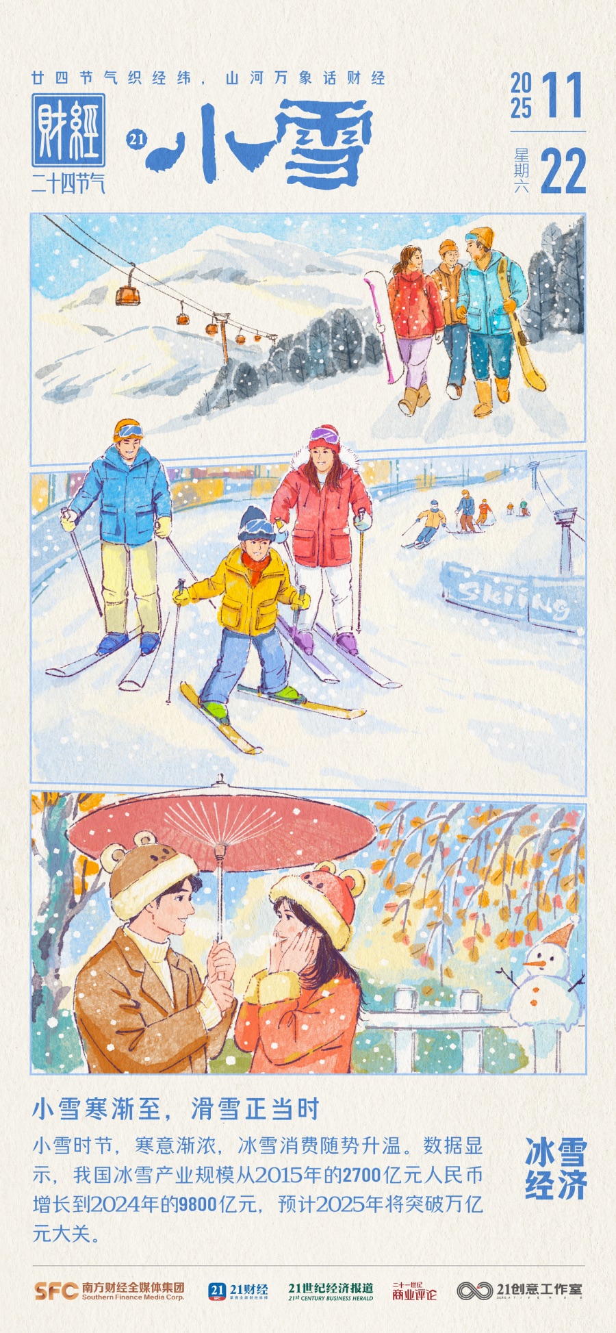 今日小雪(2025年11月22日),寒意渐浓,冰雪消费随势升温。《中国冰雪产业发展研究报告(2025)》显示,我国冰雪产业规模从2015年的2700亿元增长到2024年的9800亿元,预计2025年将达到10053亿元,突破万亿大关。