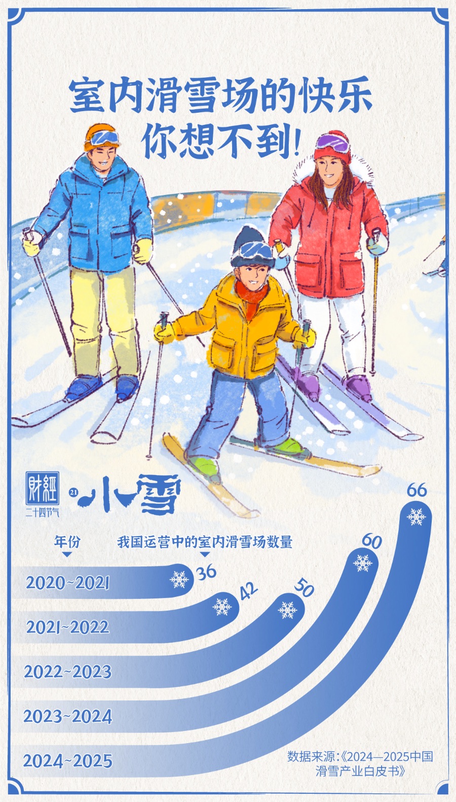 小雪节气到来,气温持续走低,冰雪运动已不再是北方的“专属项目”,正逐渐成为南方城市的消费新热点。如今,随着“北雪南移”趋势不断深化,室内滑雪场迎来爆发式增长。它不仅打破了地域与气候对冰雪运动的天然限制,更成为万亿冰雪经济版图中不可或缺的重要增长引擎。《2024—2025中国滑雪产业白皮书》显示,2024—2025年新增6家室内滑雪场,我国正常运营的室内滑雪场有66家,比上年增长10%。其中,浙江省的室内滑雪场最多,达9家,湖南省、江苏省紧随其后,分别有7家和6家。以上海耀雪室内滑雪场、深圳前海华发冰雪世界等为代表的标杆项目,正引领这一轮行业的发展热潮。公开资料显示,深圳前海华发冰雪世界于10月1日开业,开业首月接待游客超40万人次,单日客流量突破4万,室内雪场的崛起让“南方人在家门口滑雪”的愿景变为现实。