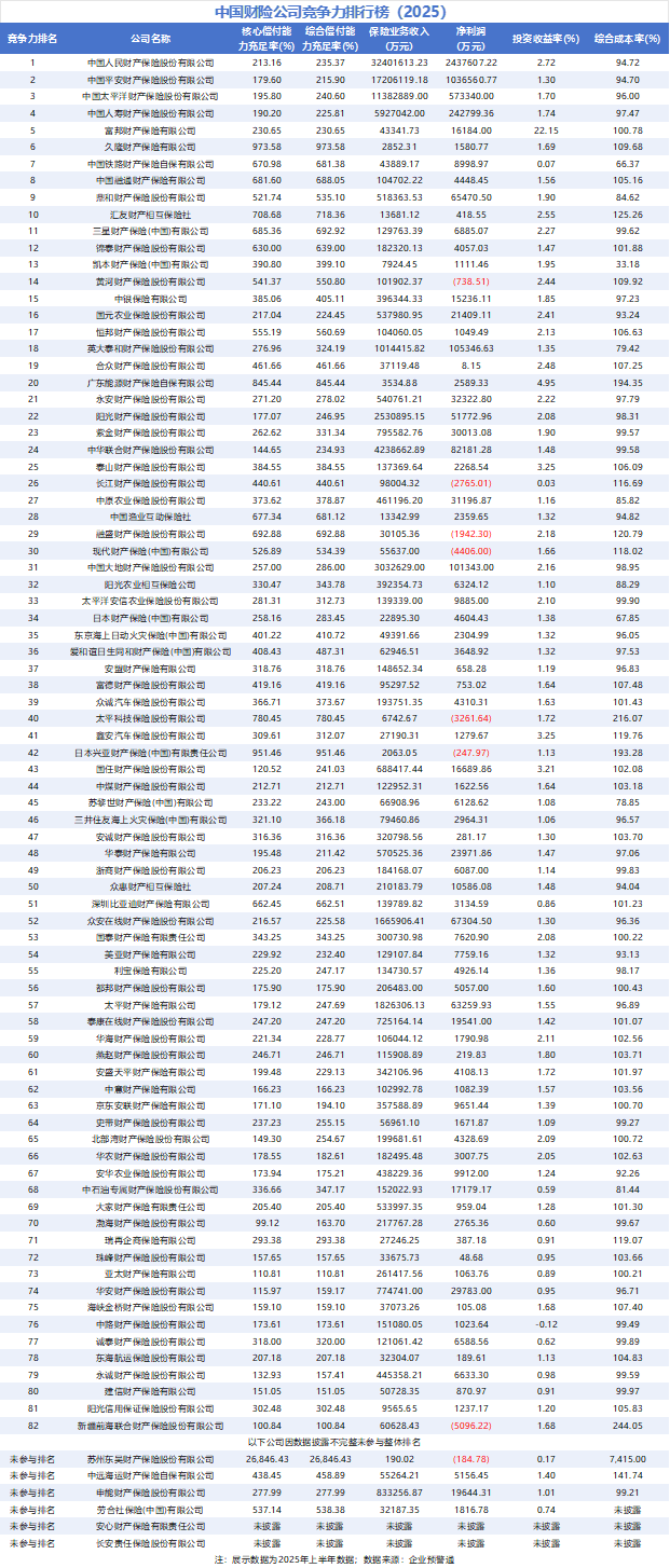 其中,中国人民财产保险股份有限公司(以下简称“人保财险”)位居榜首。2025年上半年,人保财险核心偿付能力充足率为213.16%,综合偿付能力充足率为235.37%,实现保险业务收入3240.16亿元,净利润高达243.76亿元,投资收益率2.72%,综合成本率控制在94.72%。《报告》分析认为,作为财险市场龙头,人保财险在业务规模和盈利水平上双双领先,其低于行业平均水平的综合成本率凸显了稳健的承保业务管控能力。