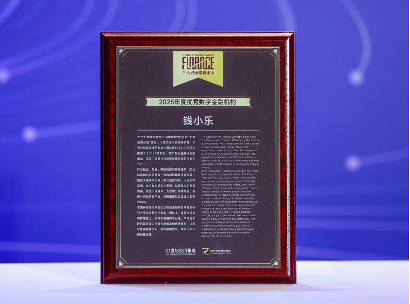 近日,在第二十届21世纪金融年会现场揭晓了“年度优秀数字金融机构”获奖名单。经过专家评审及多维度综合评估,智能信贷服务品牌——钱小乐凭借在数字金融技术应用及普惠服务方面的综合表现,入选“2025年度优秀数字金融机构”。