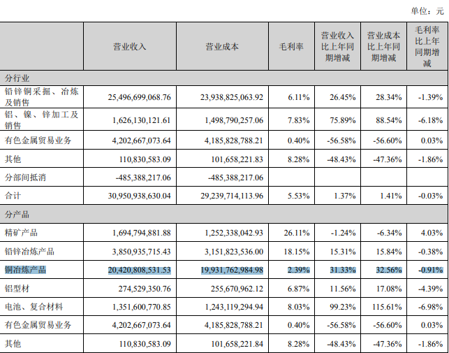 值得注意的是,铜冶炼板块是公司第一大主营业务,但是该业务整体利润率、对上市公司的利润贡献度较为一般。以今年上半年为例,铜冶炼产品营收占比达到65.69%,同期毛利率则仅有2.39%,远低于公司的铅锌产品。