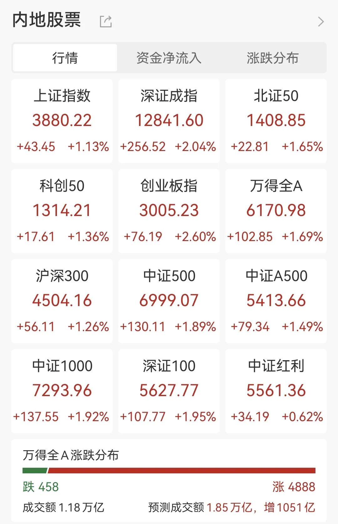 11月25日,A股三大指数集体高开高走。截至午盘,上证指数涨超1.13%,深成指涨2.04%,创业板指涨逾2.6%重回3000点上方。创业板科技龙头全线反弹,锐捷网络、新易盛、胜宏科技涨幅居前。全市场近4900股飘红。