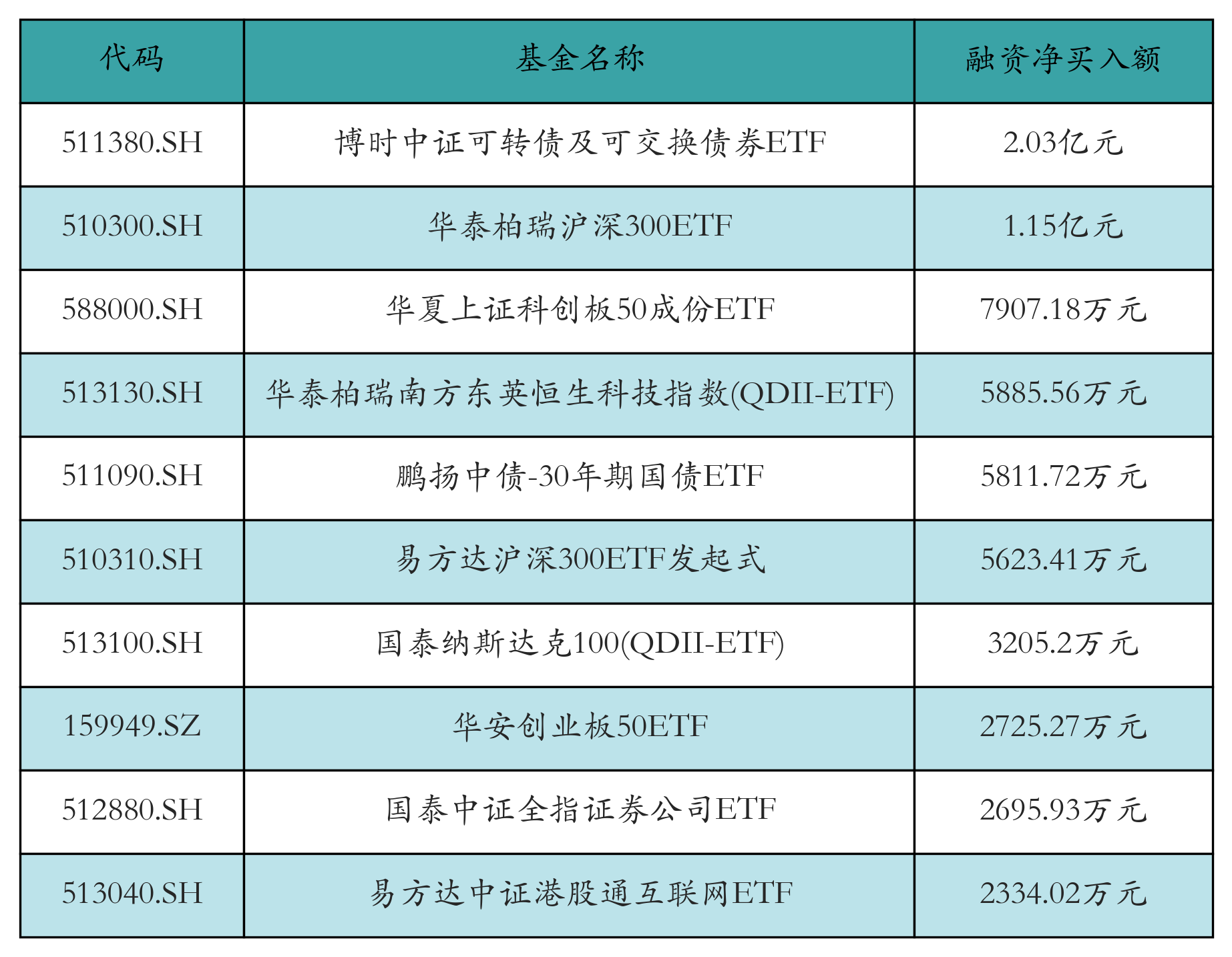 11月24日ETF融资净买入额前三位分别为:博时中证可转债及可交换债券ETF(2.03亿元)、华泰柏瑞沪深300ETF(1.15亿元)和华夏上证科创板50成份ETF(7907.18万元),前10具体见下表: