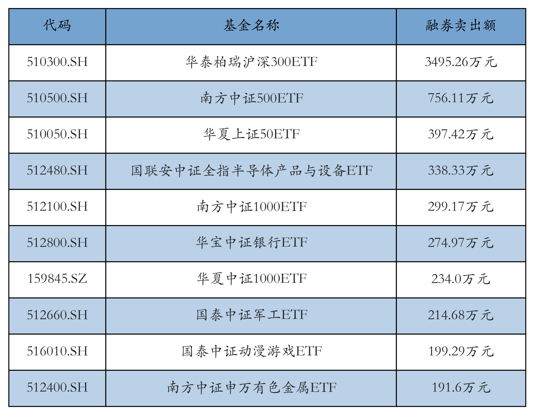 11月24日ETF融券卖出额前三位分别为:华泰柏瑞沪深300ETF(3495.26万元)、南方中证500ETF(756.11万元)和华夏上证50ETF(397.42万元),前10具体见下表: