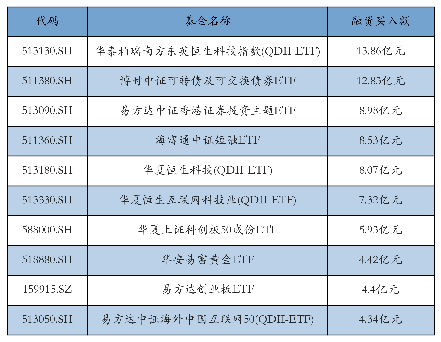 11月24日ETF融资买入额前三位分别为:华泰柏瑞南方东英恒生科技指数(QDII-ETF)(13.86亿元)、博时中证可转债及可交换债券ETF(12.83亿元)和易方达中证香港证券投资主题ETF(8.98亿元),前10具体见下表: