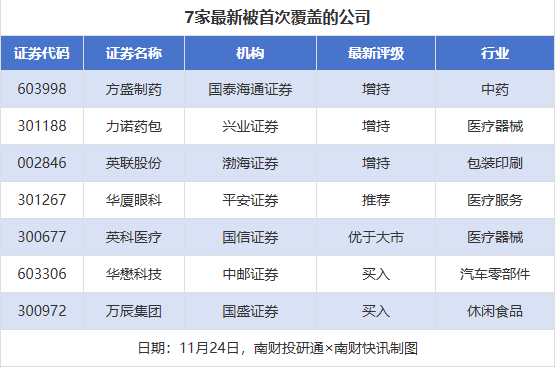 首次覆盖方面,11月24日券商共给出了7次首次覆盖,其中方盛制药获得国泰海通证券给予“增持”评级,力诺药包获得兴业证券给予“增持”评级,英联股份获得渤海证券给予“增持”评级,华厦眼科获得平安证券给予“推荐”评级,英科医疗获得国信证券给予“优于大市”评级。