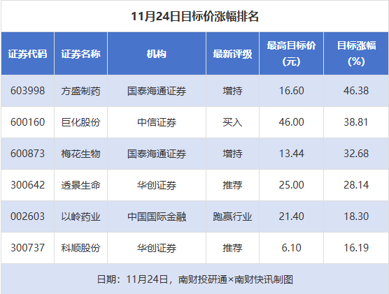 南财投研通数据显示,11月24日,券商给予上市公司目标价共6次,按最新收盘价计算,目标价涨幅排名居前的公司有方盛制药、巨化股份、梅花生物,目标价涨幅分别为46.38%、38.81%、32.68%,分别属于中药、化学制品行业。