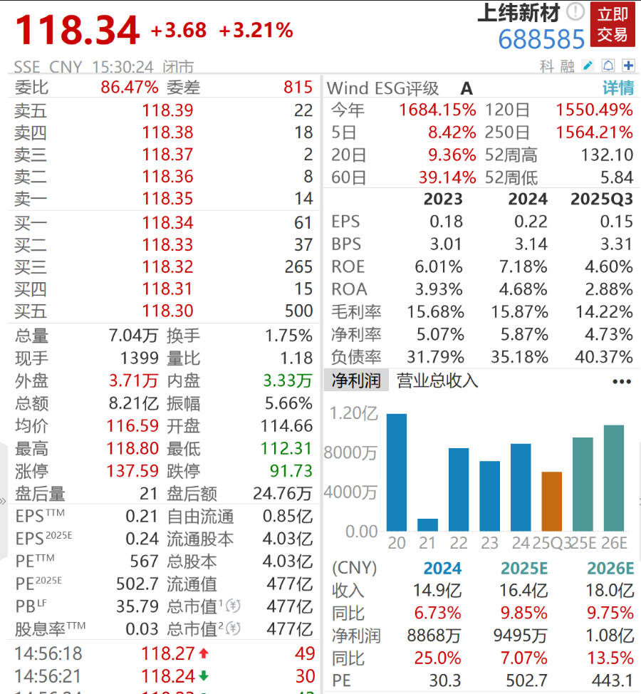 截至11月25日最新收盘,上纬新材年内涨幅超1600%。