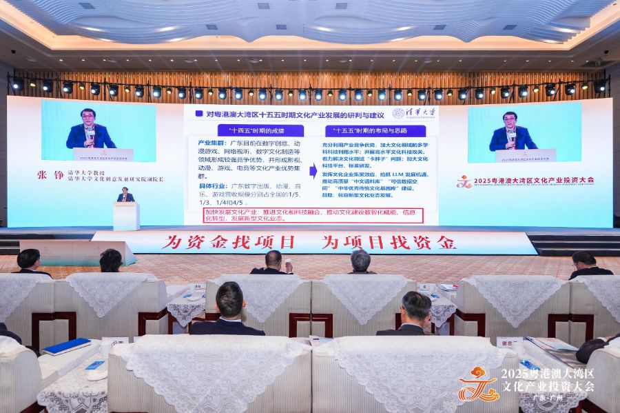 11月26日上午,2025粤港澳大湾区文化产业投资大会(广东·广州)(简称“大湾区文投会”)在广州黄埔国际会议中心举办。在主题大会上,清华大学教授、清华大学文化创意发展研究院副院长张铮发表演讲,系统总结了“十四五”时期粤港澳大湾区文化产业的发展成绩,并就“十五五”时期广东文化产业的布局思路提出建议。