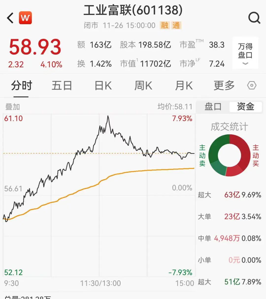 近期,工业富联股价却呈现下跌态势。自10月30日创下阶段性高点至11月24日收盘,该股累计下跌超30%,市值蒸发逾4500亿元,从最高点的1.5万亿元上方回落至1.11万亿元。11月24日更是一度触及跌停,最终收跌7.80%,报55.94元/股,创下两个月以来的新低。截至26日收盘,工业富联股价有所回升。