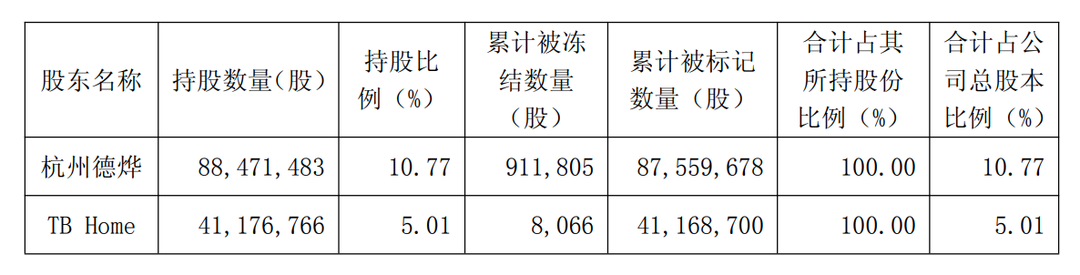 尽管杭州德烨已不是顾家家居控股股东,但上市公司11月下旬的一则公告披露,杭州德烨仍持有顾家家居10.77%的股份,为公司第二大股东,同时杭州德烨的一致行动人TB Home Limited(简称“TB Home”)持有顾家家居5.01%的股份,也就是说,顾江生家族仍合计持有上市公司15.78%股份,不过这些股份均累计被冻结(含轮候冻结)和司法标记。