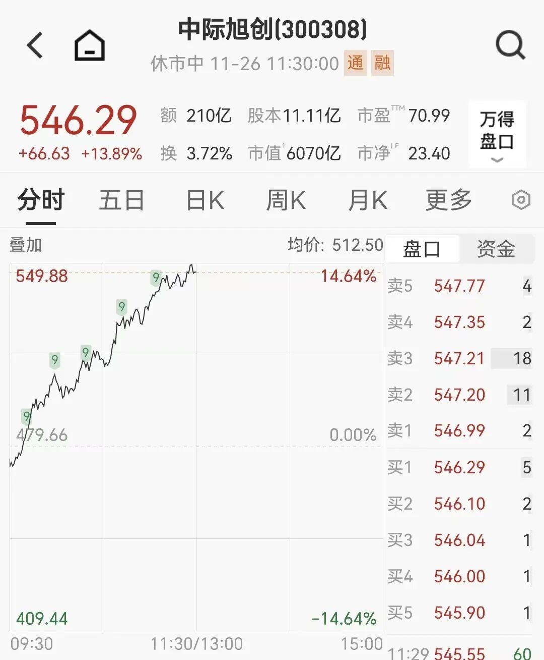 CPO概念再度爆发,长光华芯触及20%涨停,股价创逾两年新高;中际旭创涨近14%创历史新高,总市值超6000亿元;特发信息4连板,新易盛涨超10%。