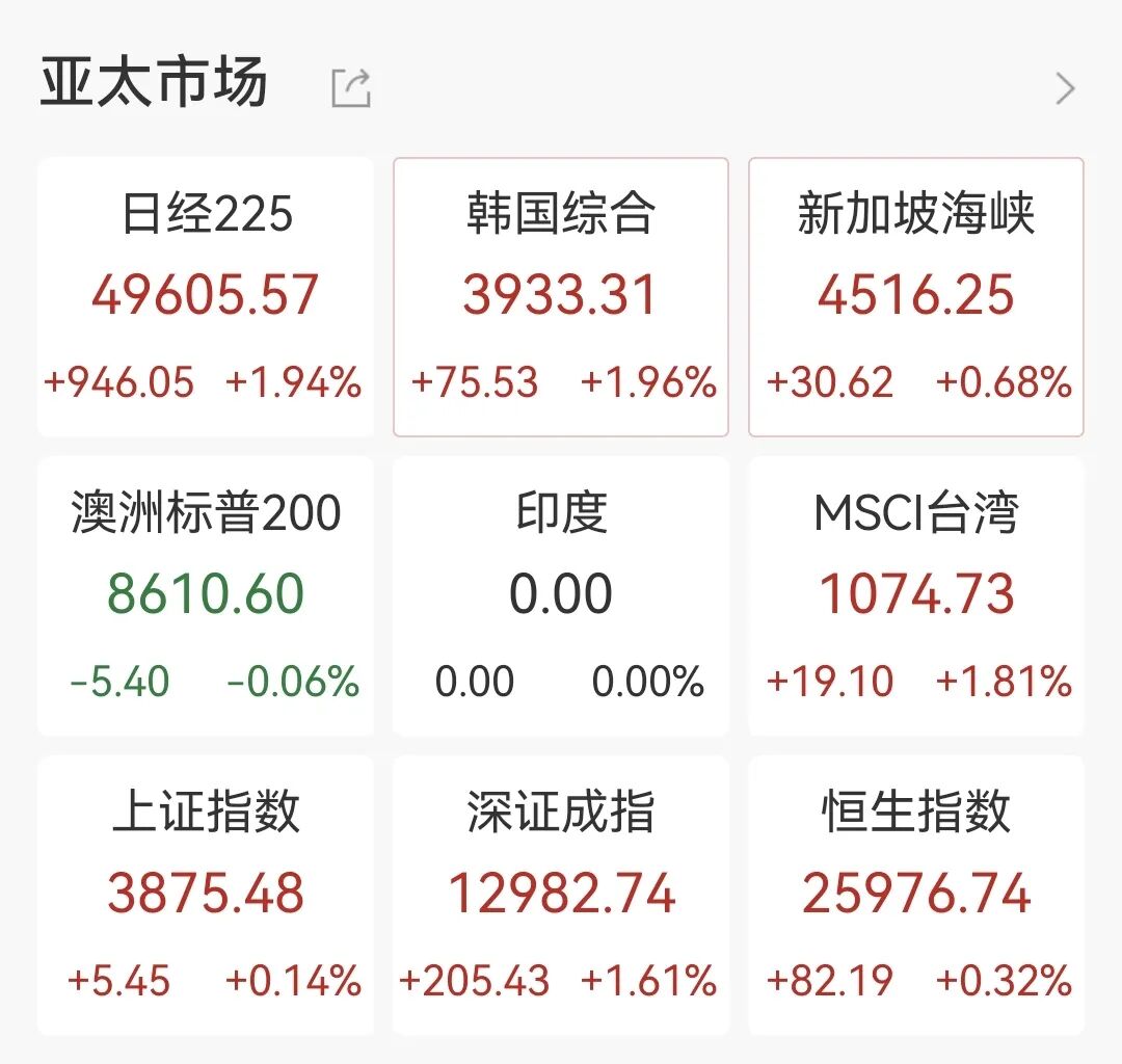 亚太股市方面,截至发稿,日经225涨1.94%,软银集团反弹近7%,索尼、日立涨近3%;韩国综合指数涨约1.96%,斗山能源涨约3.5%,三星电子、三星生物制剂涨超2%。港股方面,截至发稿,恒生指数、恒生科技指数恒生国企指数均涨0.32%,美团-W涨5.95%,中通快递涨超4%,周大福跌6.43%。消息面上,周大福11月25日公布最新财报,在截至2025年9月30日六个月内,公司共实现营业收入约389.86亿港元,同比下降1.1%。