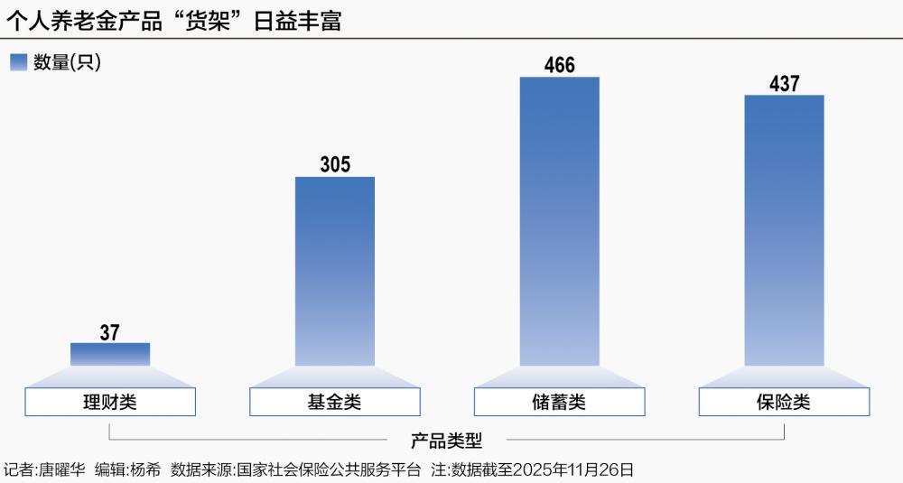 随着纳入个人养老金产品目录的产品越来越多,个人养老金产品“货架”越来越丰富,国家社会保险公共服务平台的个人养老金产品目录显示,截至11月26日,个人养老金理财产品37只,基金类产品共305只,储蓄类产品466只,保险类产品437只。2026年6月将再增加储蓄国债的选项,财政部和中国人民银行近日发布通知,明确从2026年6月起,储蓄国债(电子式)将纳入个人养老金产品范围。不过受限于各家机构代销的产品不同,在购买产品前可先查询哪些机构代销。