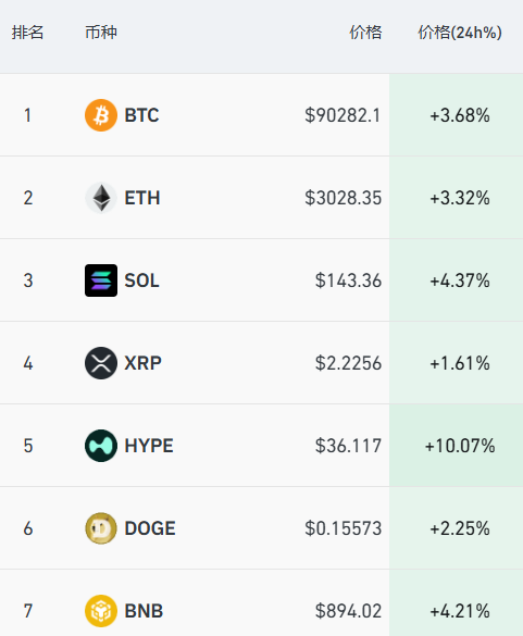 加密货币集体上涨,比特币重返90000美元上方。截至北京时间6:30,比特币涨3.68%,报90282美元/枚。过去24小时,加密货币全网超10万人被爆仓。