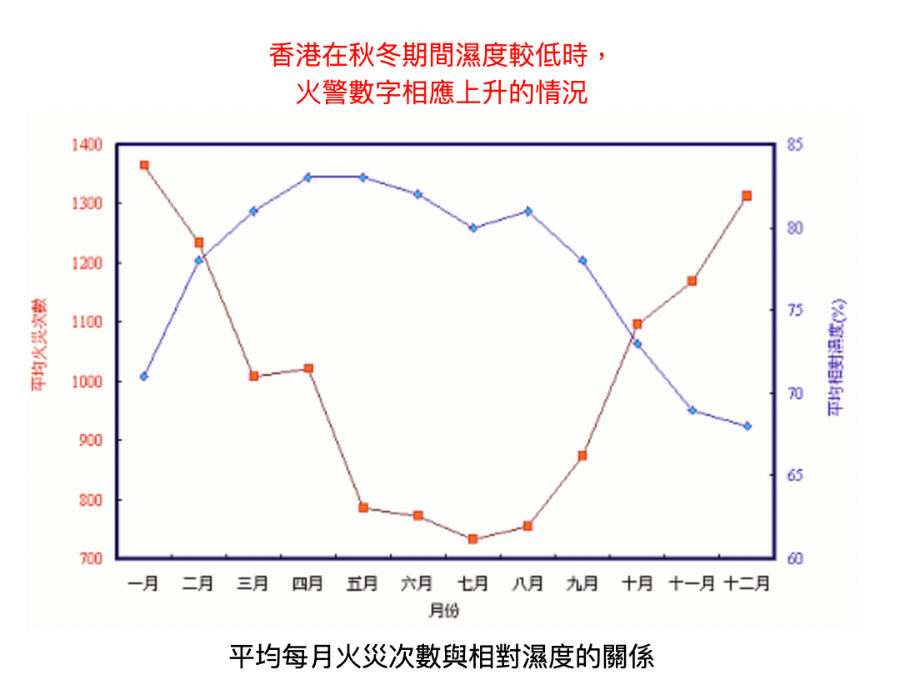 尽管香港的建筑结构不断改进,新建大厦配备了较为完善的防火设施,但火灾事故仍频繁发生。香港天文台曾在官网中分析称,秋冬两季,受东北季风带来的干燥大陆性气流影响,香港的湿度通常较低,任何物品,无论室内还是室外,都会变得干燥,火灾更容易发生。若遇上阳光普照的天气,情况会更加严重,即便是星星之火,也会在转瞬之间酿成火灾。