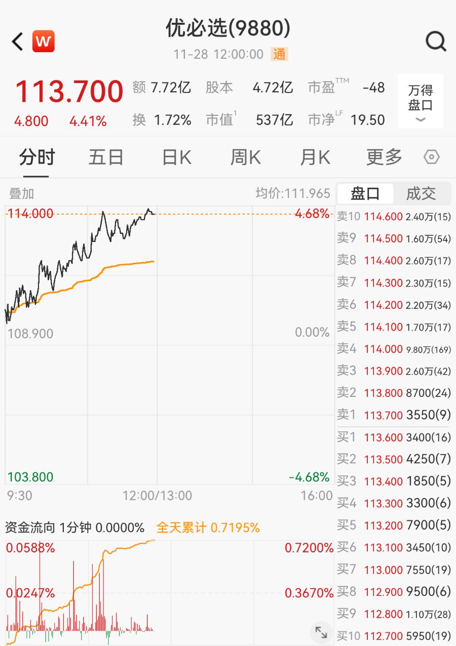 早盘,优必选港股股价震荡走高,截至午间收盘,报113.70港元/股,涨4.41%,总市值为537亿港元,年内股价翻倍。