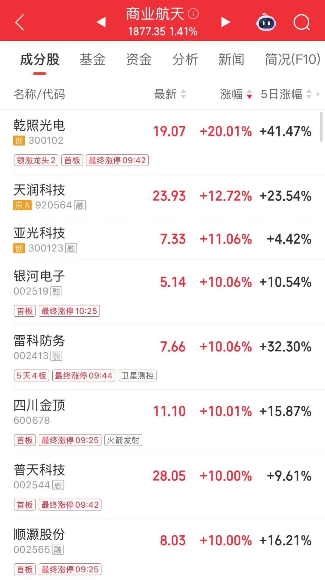 此外,商业航天概念股活跃,乾照光电20cm涨停,雷科防务5天4板,顺灏股份、银河电子、四川金顶、普天科技等多股涨停。消息面上,国家航天局日前发布《推进商业航天高质量安全发展行动计划(2025—2027年)》,商业航天被纳入了国家航天发展总体布局。