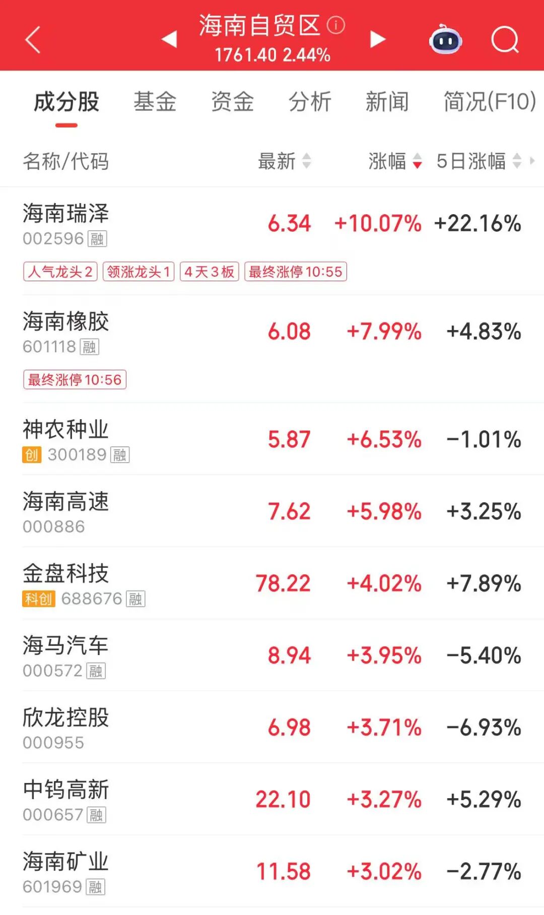 今日早盘,海南自贸概念盘中异动拉升,海南瑞泽4天3板,海南橡胶、神农种业、海南高速、海马汽车、欣龙控股等跟涨。消息面上,今年12月18日,海南自由贸易港将正式封关运作。