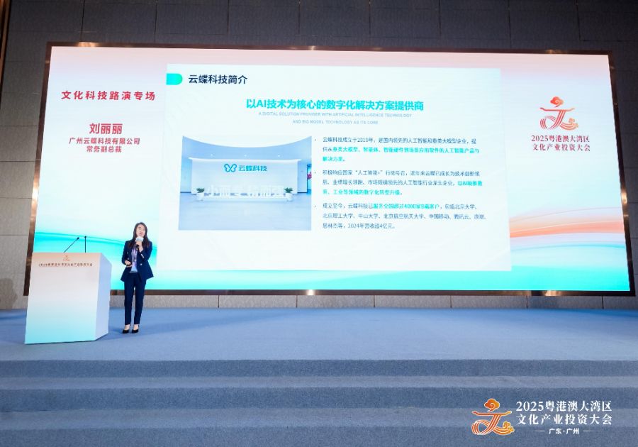 在11月26日举办的2025粤港澳大湾区文化产业投资大会文化科技路演专场上,广州云蝶科技有限公司(以下简称“云蝶科技”)作为代表性企业亮相,分享了其在人工智能领域的技术布局与商业化进展。
