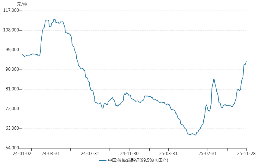 11月28日,国内工业级碳酸锂、电池级碳酸锂现货均价稳定在9.15万元/吨、9.35万元/吨,环比持稳。