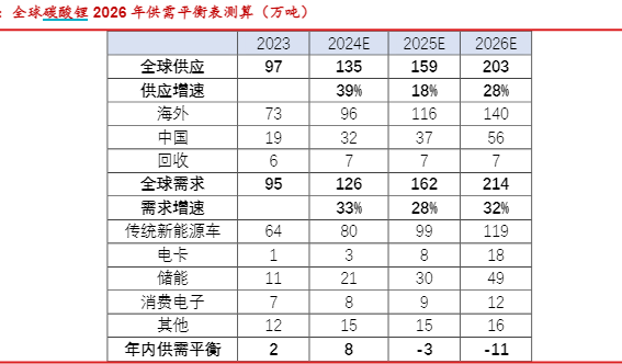 需求方面,传统新能源汽车销量增速可能放缓,但是纯电汽车比例提升,加上新能源重卡的增长趋势明确,以及中国、新兴市场等地的储能需求的持续发力,2026年全球需求有望增长32%至214万吨LCE。