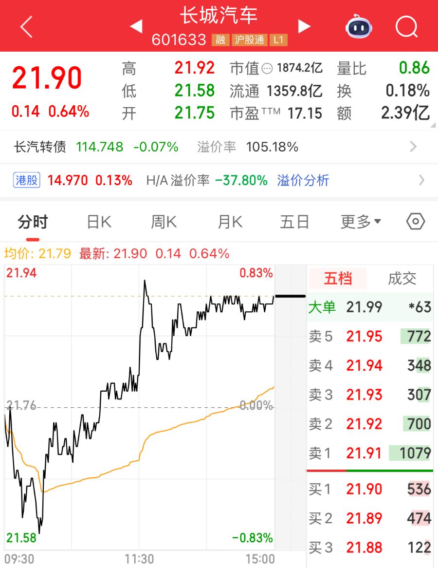 截至收盘,长城汽车A股报收21.90元/股,涨0.64%,总市值为1874亿元,年内股价跌超15%。