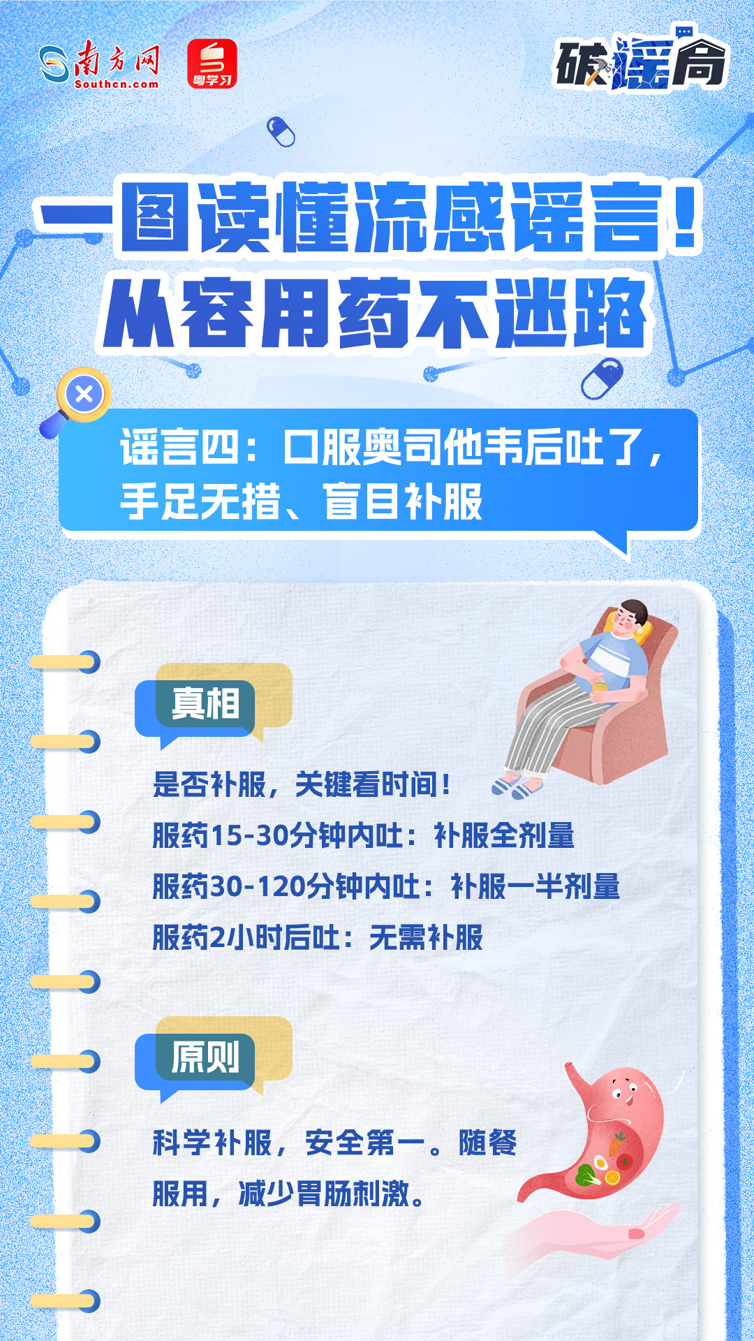 秋冬已至,全国流感进入快速上升期,医院里小患儿扎堆,家长群里“玛巴洛沙韦”和“奥司他韦”成了高频词。有人吃一次退烧,有人却越吃越吐;有人把两种药混着吃,有人刚退烧就停药……针对家长们的常见误区,带你一图读懂流感谣言,从容用药不迷路。