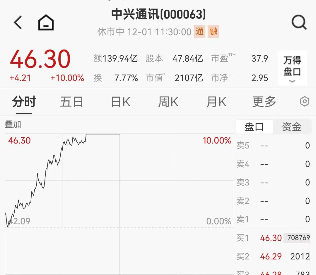 A股中兴通讯开盘后持续走高,截至发稿已触及涨停,最新股价报46.3元/股。港股中兴通讯同样大幅上涨,截至发稿,最新股价报34.62港元/股,涨超10%。