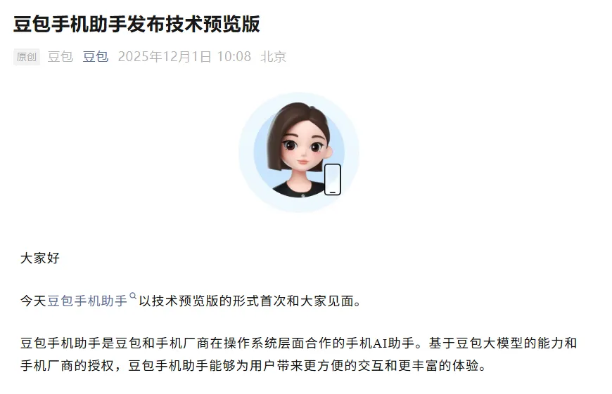 豆包今日首次发布以技术预览版形式的手机助手。豆包手机助手是豆包和手机厂商在操作系统层面合作的手机AI助手。基于豆包大模型的能力和手机厂商的授权,豆包手机助手能够为用户带来更方便的交互和更丰富的体验。